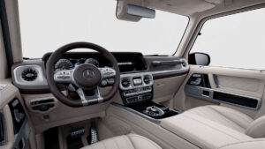 Khoang nội thất của Mercedes-AMG G 63 được đánh giá là hiện đại và rộng rãi hơn. Theo đó, không chỉ khoảng để chân sau rộng thêm 150mm mà bề ngang của xe cũng rộng thêm 68mm. Đồng thời, Mercedes-AMG G 63 cũng mang đến người dùng sự thoải mái bởi chất liệu da cao cấp cùng các tùy chọn màu nội thất thời trang.